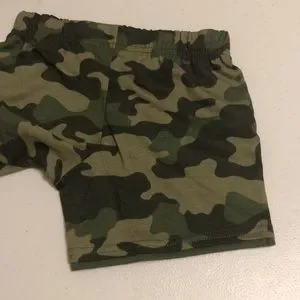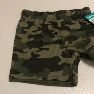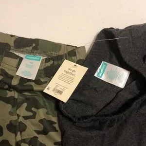 Garanimals brand. Jersey Short Solid/Print Set sized 18 Months. First Pair is in Camouflage print using Black, Green, and Tan colors. Solid Green edging at bottom of each leg attached to add a layered appearance. Cotton texture. Second pair is solid Gray colored, but does have a slight heathered look. Green trim in jersey-like material added at bottom of each leg creating a layered look. Soft cotton texture with jersey texture at trim. Elastic waistbands. Lightweight. New With Tags. See photos for additional description and condition.