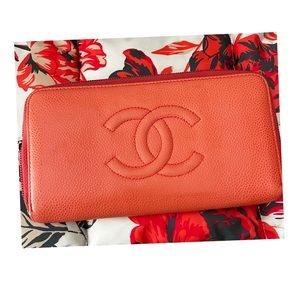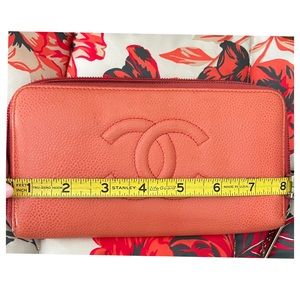 Chanel long gusseted wallet in light red/coral with silver hardware.