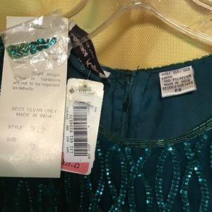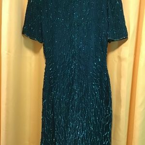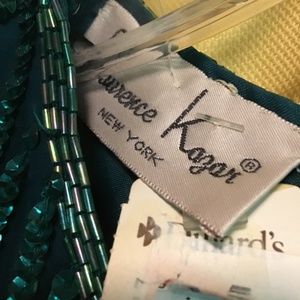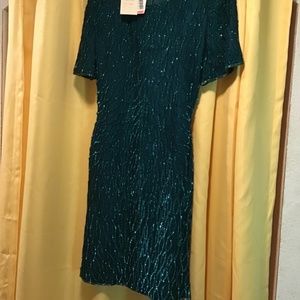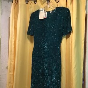 SEQUINS AND SHINE! New with tags Lawrence Kazar Emerald green Petite Small dress! Size measurements: Bust 37 inches, waist 29 inches, hips 34 inches, length 37 inches, sleeve openings taken at bottom of sleeve 14 inches. slit for walking. This dress will make any hair color and eye color POP!