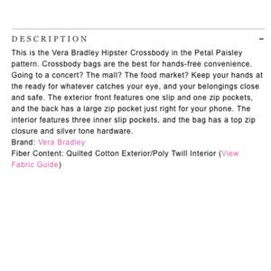 Vera Bradley Navy Colorful Petal Paisley Crossbody Bag Purse. Measures approx. 10 inches wide, 11 inches tall and 1 inch deep. Strap is adjustable. Cotton shell, polyester lining. Preowned condition, light wear. See photos.