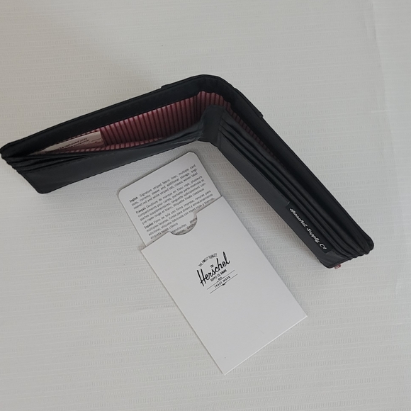 Herschel Johnny Black Wallet. Can be unisex. Signature striped fabric liner, 6 card slots, currency sleeve, and 2 additional storage slots with classic woven label on the front. Brand new without tags but comes with authentic card. Never used.