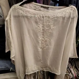 New York and Company white sheer poncho, one size. Can be dressed up or down. Has designer stitching and sequence along the edges.