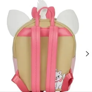 The front of the backpack is shaped like a white frosting, sprinkle cupcake with lace ruffles, topping the pink-striped cupcake liner. Marie’s ears poke out from beneath the white frosting, along with a tuft of her fur, pulled into a pink bow. On the back of the backpack, Marie poses. Note the coordinating lining, which carries a Marie and cupcake motif pattern. This backpack features pink adjustable straps, sturdy gold zippers and hardware, vegan leather (polyurethane), and embroidered, debossed, applique, printed, and lace details.