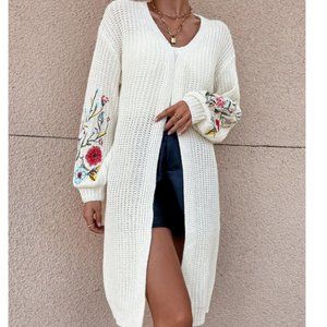 Floral Embroidered long sleeved open front knit Duster sweater Cardigan