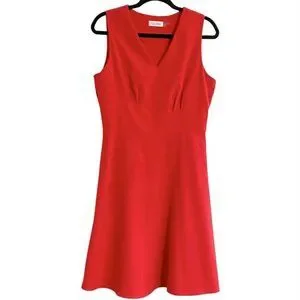 Calvin Klein Sleeveless V-Neck Amaranth Red Fit & Flare Woven Dress Size 10. Gorgeous shade of red in poly blend woven lined fabric. 39.5” long, 19” armpit to armpit, 16.5” waist seam to seam, 22” hips seam to seam. Preowned, no signs of wear, beautiful dress!