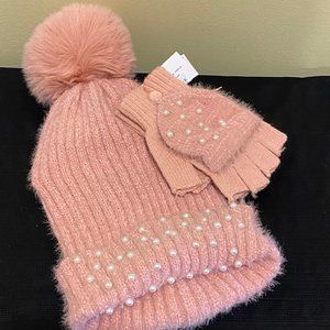 Beanie Cap & Mittens NWT Pink Pearl Embellished