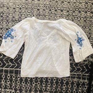 summery sheer white blouse with blue embroidery and tassels