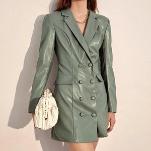 GREEN PU LEATHER DOUBLE BREASTED BACK LACING BLAZER DRESS TRENDING COLOR CHIC