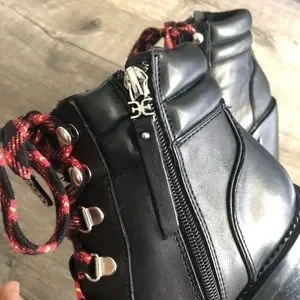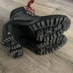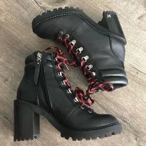 Sam Edelman high heel lace up hiking boots with side zipper are in like new condition. Worn once. So comfortable and a great looking heeled hiking boot. The side zipper makes it so convenient to take off and on. Perfect with jeans and cords!