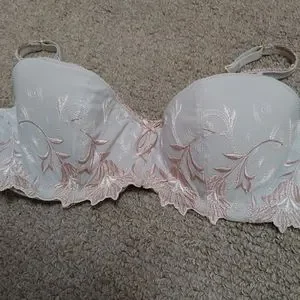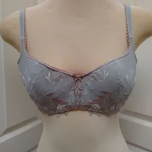 Palest mint green balconette bra has gorgeous embroidery, lace edging on the front/straps and light padding. Size 38C