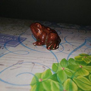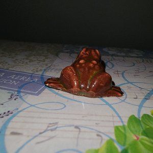 Circa 1960's miniature ceramic brown frog figurine. Several small chips. Some glue on bottom. Please see photos for overall condition, wear & tear. The photos are part of the description. Approx. size: 5/8" tall x 1 3/8" wide x 1" deep . Needs cleaning. Could shine with detailed cleaning - will leave method and extent to knowledgeable new owner. Has been in a display cabinet for decades. Smoke free home.