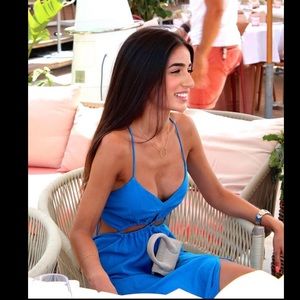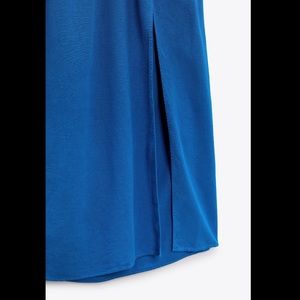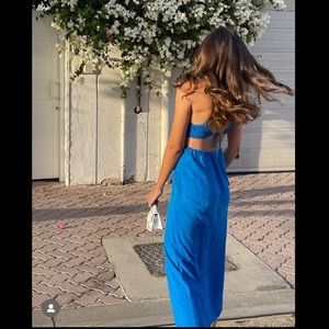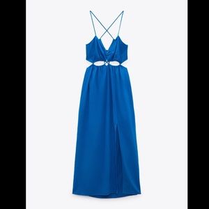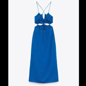 Midi dress made of linen blend fabric. V-neckline with thin cross-back straps. Openings at waist and elastic smocking at back. Front slit at hem. Back tie closure.