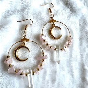 Crescent Moon Rose Quartz + Clear Quartz Earrings
