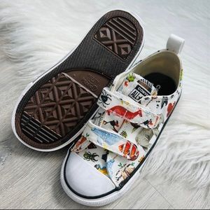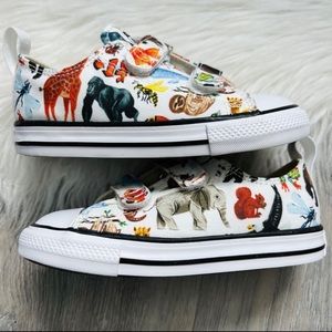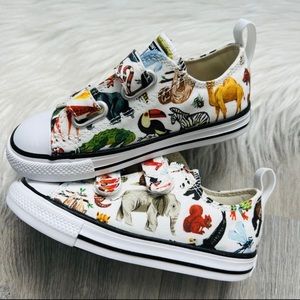 Brand new with box ( without lid ) 100 % Authentic ! The legend since 1957 , when basketball players gave their high tops a chop . Essential elements like a diamond pattern outsole and " All Star " license plate still make the cut , while two hook - and - loop straps allow for easy on and off . Animals take over the canvas upper for a wild print you won't find in textbooks . With a SmartFOAM sockliner for extra comfort . It's a jungle out there . FEATURES AND BENEFITS : Low - top sneaker with two hook - and - loop straps for easy on and off . All - over print featuring a textbook variety of animals . Soft , kid - friendly lining . SmartFOAM sockliner for comfort .