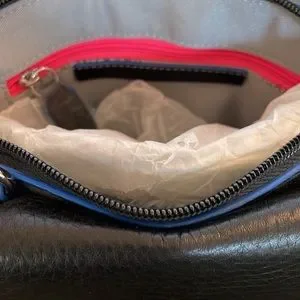 Bag has 2 separate sections; front section is open inside; back section has a zip wall pocket and 1 pocket slot.