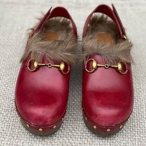 Gucci Amstel Horsebit red leather fur clogs.