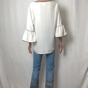 Calvin Klein, White Tunic Blouse Medium Size Has a V- Neck Detailing a Hi-Low Ruffle Hem with Black edges. From neck to bottom 19”, Width 22 1/2”, Shoulder to Shoulder 19”. Pre- Owned, Made in Indonesia.