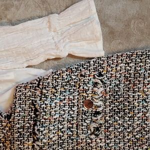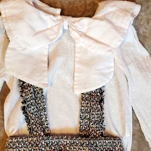 This is a cute 2 pc set. A skirt with suspenders in white black and other cute colors. The blouse is white with a collar. Both are size 120-5/6Y, very well taken care of flawless
