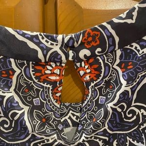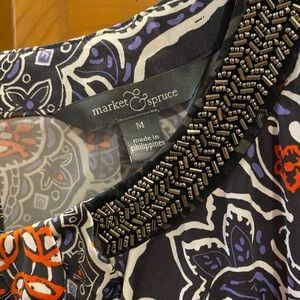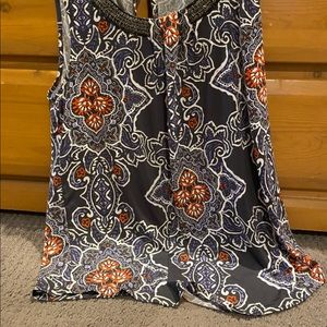 Reposhing this cute top. It is a fun print of blues, white and red/deep orange. The beading at the neckline adds just enough bling. Looks great with a denim jacket.