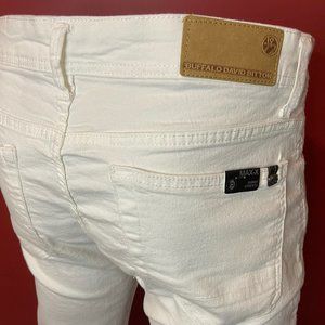 Buffalo David Bitton Men's White Max-X Skinny Stretch Jeans - Size 34/32 - NWT. MSRP: $119.00. 79% cotton, 20% polyester, 1% spandex. Two front pockets, plus coin pocket, two back pockets. Zip fly.