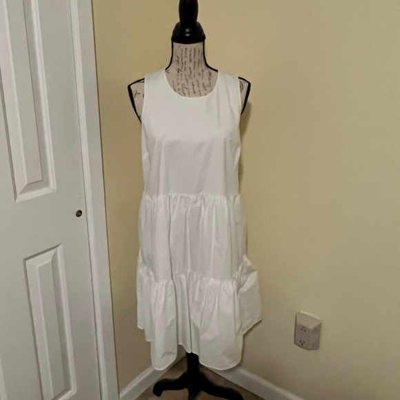 A soft white freeing dress. Beloved for its freeing shape, this lightweight linen dress is cut with and utility-inspired topstitch details that add soft structure to its feminine form.