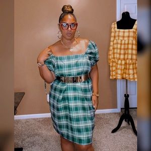Green and yellow plaid dress comes with square neck and balloon short sleeves. Long back zipper. Super cute casual day dress, wear with cute sneakers or strappy sandals. Belt/glasses not included but can be purchase by request