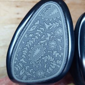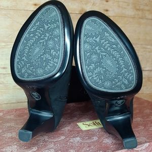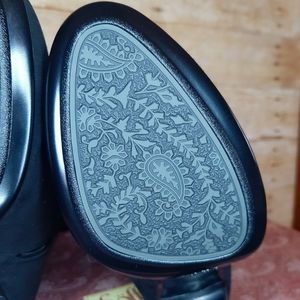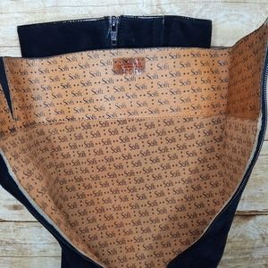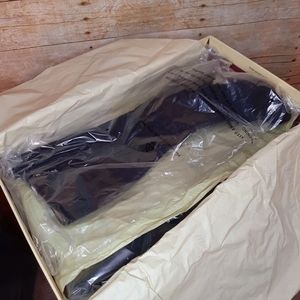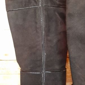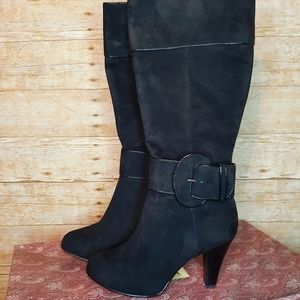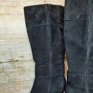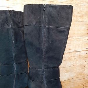 These are AMAZING boots!! NWT!! I tried them on, but never ended up wearing them. Black suede material (some photos make the material look flawed, but it is not...just lighting). Zipper on the inside calf that goes down to the ankle. So comfy! small white sticker (?) residue on the inside of one boot, see pics. 14" from top of boot to top on heel base. 3.5" heel. 17.5" from top to bottom, total. Last photo shows how these have been stored. Smoke free home.