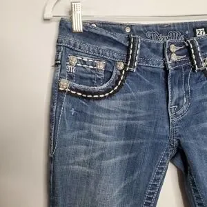 EXCELLENT pre-owned condition: Miss Me Y2K Crystal Wings Bootcut Jeans in Medium Wash. Features zipper fly, 5 pocket styling and gorgeous crystal embellished angel wing shaped pockets. MSRP $109