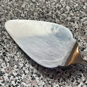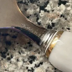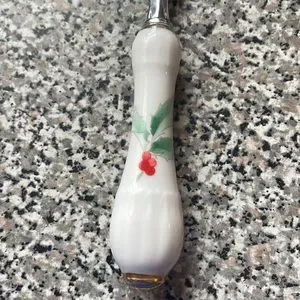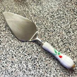 Noritake silver cake server with white ceramic handle. Small holiday design on the handle. This is gently used and has signs of wear on the silver but is still elegant and would be perfect serving for holiday cakes.