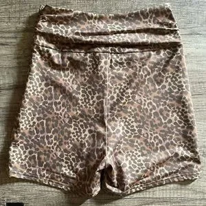 Athletic vs athleisure cheetah print shorts. Comfy and thick material for a flattering fit. High-waisted. Side zipper well-hidden. Size small - a little too tight in the waist for me (~size 6). Midline seam 11 inches long, side seam 14.75 inches long. Shell and lining is a polyester spandex blend.