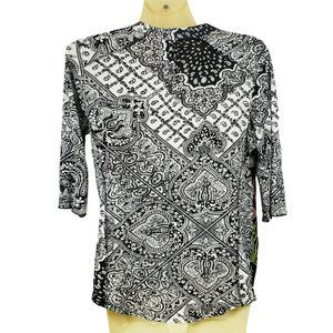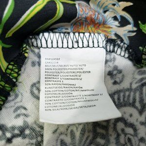 The Effie Blouse by Tiny for Anthropologie. Floral silky printed front with a garden explosion and a soft jersey fabric for the sleeves and back. Roll tab cuffs on the 3/4 sleeves. V-Neckline. Lightweight and perfect for spring and summer!