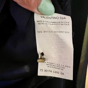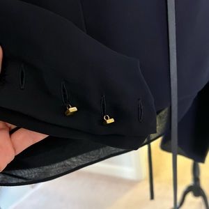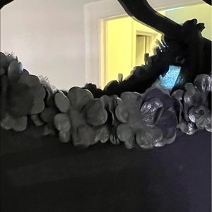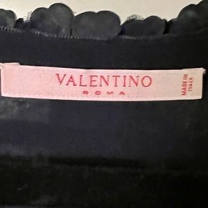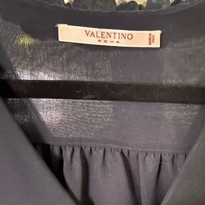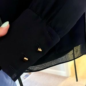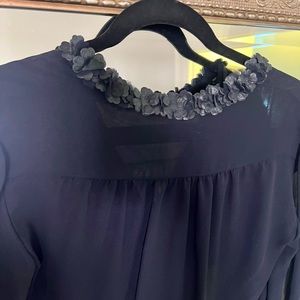 Beautiful black top with leather flowers and ties in excellent condition. Missing 2 buttons on each cuff. I wore as is and not noticeable. Easy to add button or change them. One extra button included. Darts on the bottom sides for nice fit. No tag for size but I would say small.