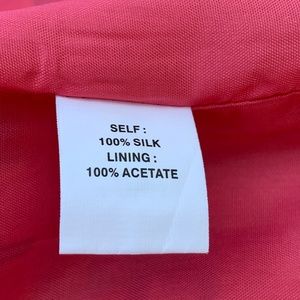 Cap sleeve sheath dress with cinched elastic waist. Geometric print. Exposed back zipper. Hem stitch detail. Lined. 100% silk.