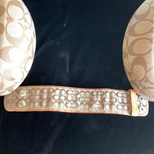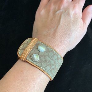 Authentic Coach signature pattern leather and fabric cuff bracelet. Made in Italy. Snaps work properly and close tightly into place. Very good preloved condition. Please see photos for condition.