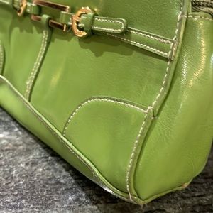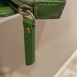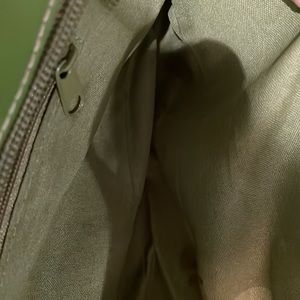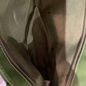 The material is leather and it has a beautiful grass green color.I’m am very sorry but it has a few coffee stains inside I have tried to get the stains out but maybe someone has something better than what I used😄