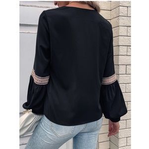 Eylet Embroidery Trim V-Neck Boho Shirt Black , Long Lantern Sleeve