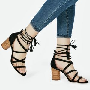A faux stacked cone heel sandal with a lace up tassel tie closure.