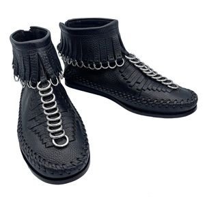 The Montana Fringed Boot is a contemporary take on a traditional style, ALEXANDER WANG introduces a fringe moccasin boot with engineered woven pattern and high-shine ring hardware trim detail. ***RARE***