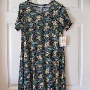 LuLaRoe Carly dress for ladies size XS extra small. This new with tags dress retails for $45 and has a high low bottom hem, one small breast pocket, short sleeves and a scoop neckline. Stretch fabric, made from a polyester/spandex blend, machine wash.