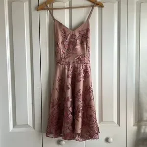This dress has been only worn once for homecoming, which it was perfect for or even a wedding. Has embroidered flowers covering the entirety of the dress. has a zipper in the back and has crisscross straps.