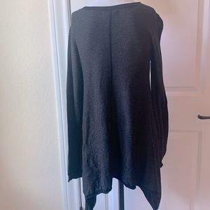 Super soft with subtle stripes is 60% cotton 40% rayon sweater drapes beautifully. Length from him from shoulder to hem and center is 21 inches and 32 1/2 on the sides. Width across the bust from arm to armpit is 16 inches. Sleeves are 26 inches long. No sign of wear, ships in one day from nonsmoking home.