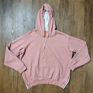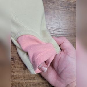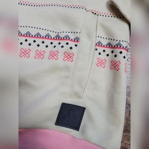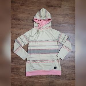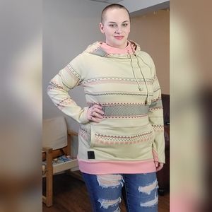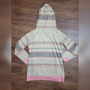 Ampersand Avenue double hood hoodie. Pullover hoodie. Cream with a grey, pink, and black striped print. Pink inner hood, and pink waistband trim. Asymmetrical drawstring and zipper at neck. Longline. Folded in thumbholes. Super cute and cozy! This is in great shape. Tag says XXL but this fits more like an XL.