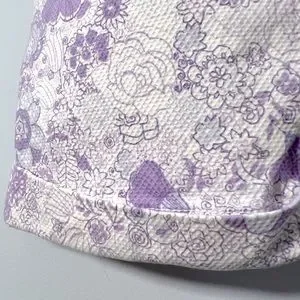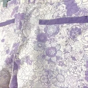 Textured cotton/spandex capri pants for girls have adjustable waistband, slit accent pockets on back, and are cuffed at calf-length pant leg. Easy care capri pants have light stain near cuff on one leg (see last photo) from ironing.
