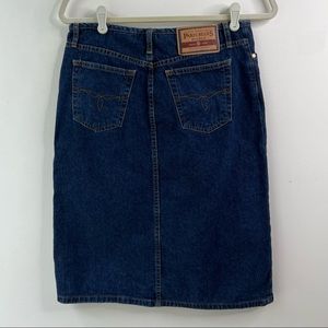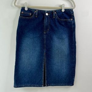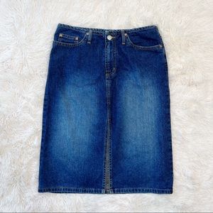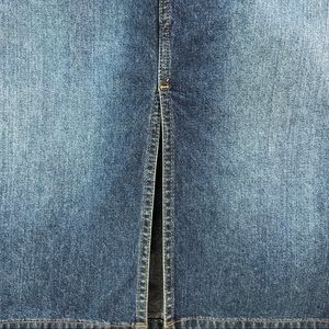 Vintage Y2K high waisted jeans skirt below knee front slit dark denim Sz3