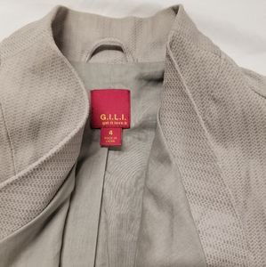 open front printed leather jacket by G.I.L.I. cloud grey color. comfortable, stretchy fabric on the bottom of arms for easy fit. like new. nice layering piece as it's not bulky. pockets. size 4.