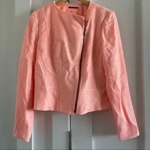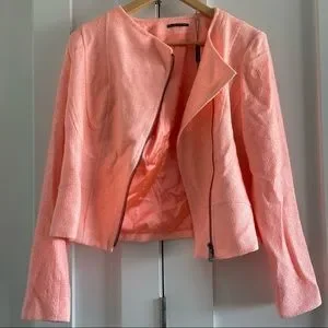 Brenna jacket from Elie Tahari in Peach Glow. Can be dressed up or dressed down with jeans. New, never worn. Not stretchy but good fit. High quality. Has Chanel feel. Zip front is at an angle. Makes you look expensive. Peach color. Tweed material. Satin lining. Never worn.