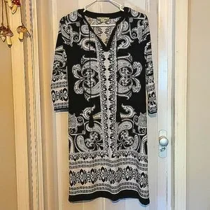 Womens Petite Medium sz black and white 3/4 sleeve dress. Tags removed but purchased 2020, never worn. Knee length, Hanni brand. Smoke free home
