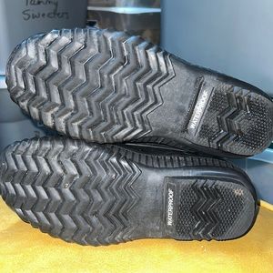 Black Sorel boots size 9 mens. Top is leather and bottom is a water boot. Only worn a couple of times. Fits true to size. Super comfy and popular boots. Hate to see them go.