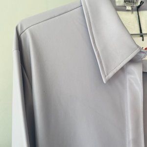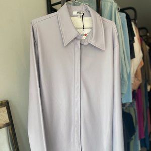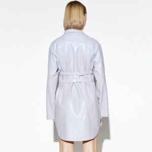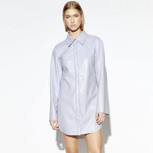Vegan leather shirt dress in a stunning Lilac color. This piece is Sarah's top pick. It is super yummy and soft. Wear as a shirtdress, a shirt paired with leggings or skinny leg jeans, or, even as a short duster-worn un-buttoned.