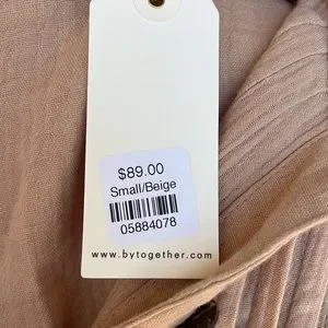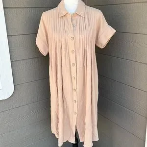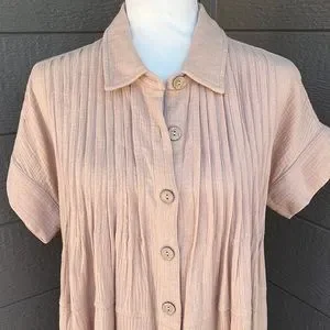 By Together Oversized Button Up Dress. Pleated bodice, hip pockets, slits up each side. Soft and flowy. Beige in color